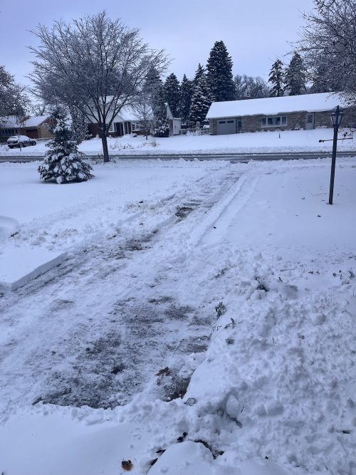 I just finished clearing all the sidewalks and the driveway. The ground isn’t frozen so it wasn’t too difficult to scrape off the 1/2 inch of ice topped with crusty snow, and snowplow it onto the boulevards.