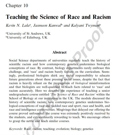 Last year, I incorporated a significant unit on race and genetics; this year, I’m going to prepare the students a little better by including readings from the scientific literature throughout the semester, so I’ve been searching for good, easily digestible papers on the subject. One that I found (but probably won’t use in the course) is “Teaching the Science of Race and Racism,” by Kevin N. Lala, Jasmeen Kanwal, and Kalyani Twyman, which came from this book, Innovations in Decolonising the Curriculum: Multidisciplinary Perspective. The abstract for the paper hit me a bit hard, personally.