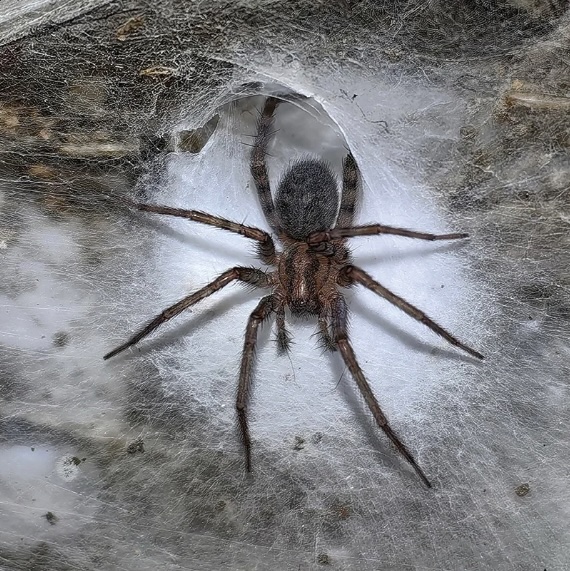 They’re one of the bigger spiders around here. They’re funnel web weavers, and they like dark corners of your garage or basement, where they build dense sheet webs with a characteristic funnel, where they live. I’ve been startled by these guys — if you poke around and disturb them they will leap out to run away. They’re very fast.