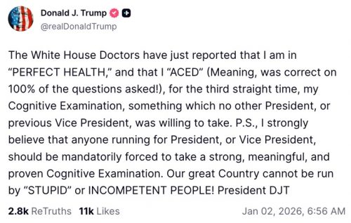 The White House Doctors have just reported that | am in “PERFECT HEALTH,” and that | “ACED” (Meaning, was correct on 100% of the questions asked!), for the third straight time, my Cognitive Examination, something which no other President, or previous Vice President, was willing to take. P.S., | strongly believe that anyone running for President, or Vice President, should be mandatorily forced to take a strong, meaningful, and proven Cognitive Examination. Our great Country cannot be run by “STUPID” or INCOMPETENT PEOPLE!