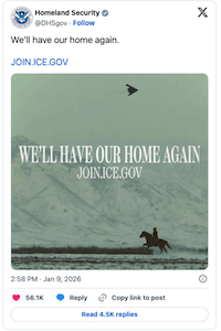 On January 9, the Department of Homeland Security (DHS) posted, “We’ll have our home again,” a lyric from an anthem adopted by the neo-fascist group The Proud Boys and other white nationalist organizations. This was accompanied by a link where one could sign up to join ICE.