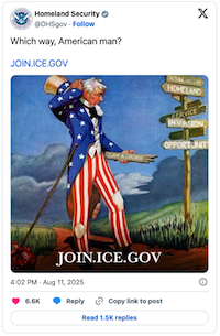 Last August, DHS shared an ICE recruitment poster beneath the phrase, “Which way, American man?” — an apparent reference to the white supremacist tract, “Which Way, Western Man?” which argues that “Race consciousness, and discrimination on the basis of race, are absolutely essential to any race’s survival. … That is why the Jews are so fiercely for it for themselves…and fiercely against it for us, because we are their intended victim.”