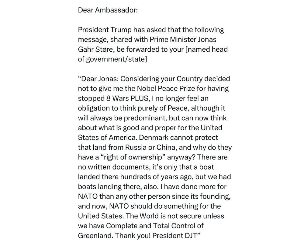 “Dear Jonas: Considering your Country decided not to give me the Nobel Peace Prize for having stopped 8 Wars PLUS, | no longer feel an obligation to think purely of Peace, although it will always be predominant, but can now think about what is good and proper for the United States of America. Denmark cannot protect that land from Russia or China, and why do they have a “right of ownership” anyway? There are no written documents, it’s only that a boat landed there hundreds of years ago, but we had boats landing there, also. | have done more for NATO than any other person since its founding, and now, NATO should do something for the United States. The World is not secure unless we have Complete and Total Control of Greenland. Thank you! President DJT”