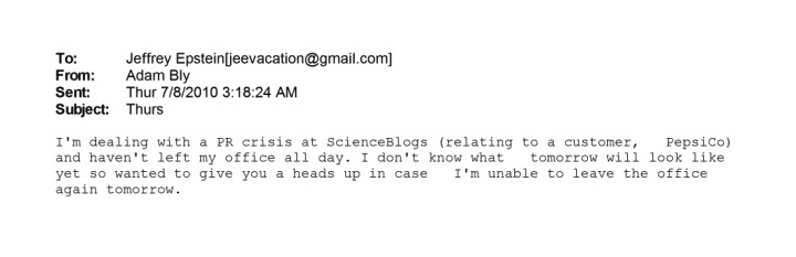 This next one is very much inside baseball. I was on Scienceblogs, along with a lot of other very good people, which was founded by Adam Bly, who was also connected to Brockman. Bly got a lot of money from somewhere, I don’t know where, enough to launch a blog networks and a print magazine, but this email suggests to me that one of his sources was Jeffrey Epstein. Now I feel tainted.