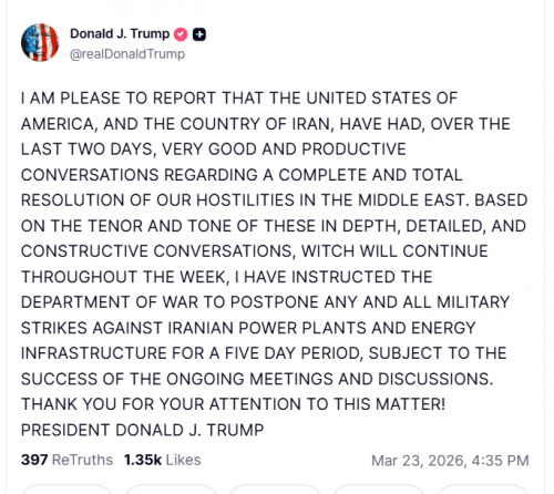 I AM PLEASE TO REPORT THAT THE UNITED STATES OF AMERICA, AND THE COUNTRY OF IRAN, HAVE HAD, OVER THE LAST TWO DAYS, VERY GOOD AND PRODUCTIVE CONVERSATIONS REGARDING A COMPLETE AND TOTAL RESOLUTION OF OUR HOSTILITIES IN THE MIDDLE EAST. BASED ON THE TENOR AND TONE OF THESE IN DEPTH, DETAILED, AND CONSTRUCTIVE CONVERSATIONS, WITCH WILL CONTINUE THROUGHOUT THE WEEK, I HAVE INSTRUCTED THE DEPARTMENT OF WAR TO POSTPONE ANY AND ALL MILITARY STRIKES AGAINST IRANIAN POWER PLANTS AND ENERGY INFRASTRUCTURE FOR A FIVE DAY PERIOD.