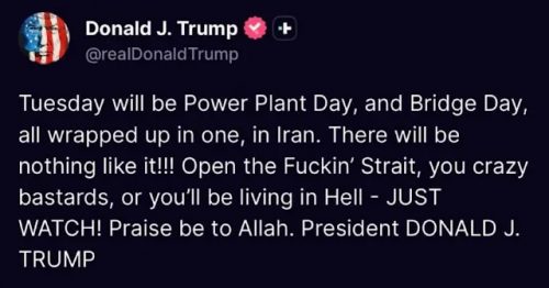 Tuesday will be Power Plant Day, and Bridge Day, all wrapped up in one, in Iran. There will be nothing like it!!! Open the Fuckin’ Strait, you crazy bastards, or you’ll be living in Hell – JUST WATCH! Praise be to Allah. President DONALD J.