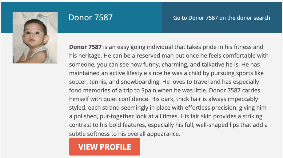 I would recommend adding a more appropriate button to the website: a “RANDOM CHOICE” button. Click it, they’ll send your doctor a completely random arbitrary vial from their vast collection. You’ll be surprised! But no more surprised than if you carefully choose the father of your child based entirely on a profile on a website.