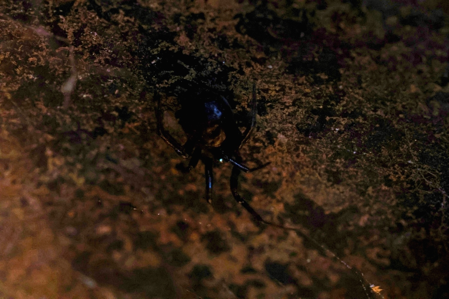 S. borealis is entirely black in body color, and she was on the side of a black bin, in shadow, deep in darkness, so getting any kind of photo was difficult. But there she was, my first Theridiidae of the new season.