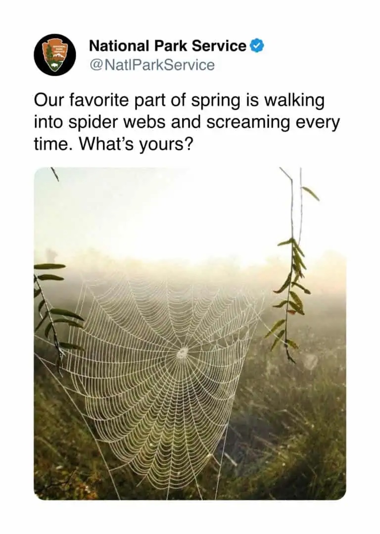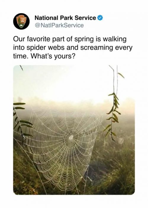 “Viewpoint diversity” is a misleading way to say “conservative welfare” » « My poor spiders Screaming for joy? I can relate to this National Park Service message. Our favorite part of spring is walking into spider webs and screaming every time. What’s yours? I wish. I haven’t seen any webs yet, although I have spotted some individual strands of silk. Warm weather is coming, though! Share this:PrintEmailShare on TumblrTweet “Viewpoint diversity” is a misleading way to say “conservative welfare” » « My poor spiders