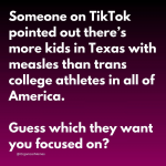 Someone on TikTok pointed out there are more kids in Texas with measles than trans college athletes in all of America.