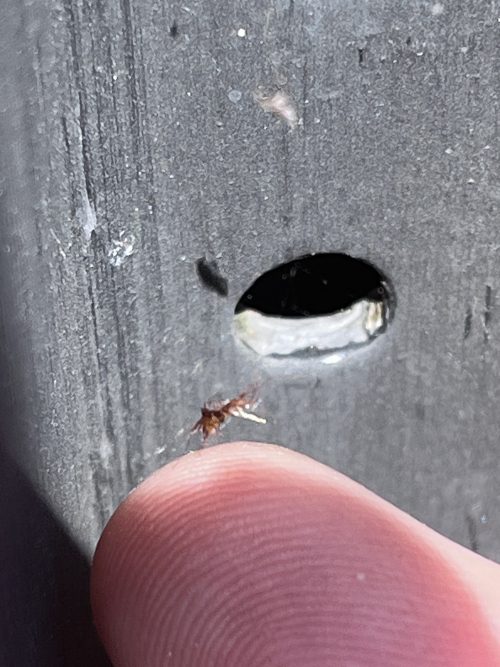 That’s a dead dessicated Dipteran by my finger (I had to poke my finger in to stabilize the victim — it’s windy today, and everything on silk was vibrating madly). So…they’re catching gnats and flies and mosquitos that encounter the tangle of cobweb silk.