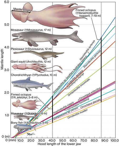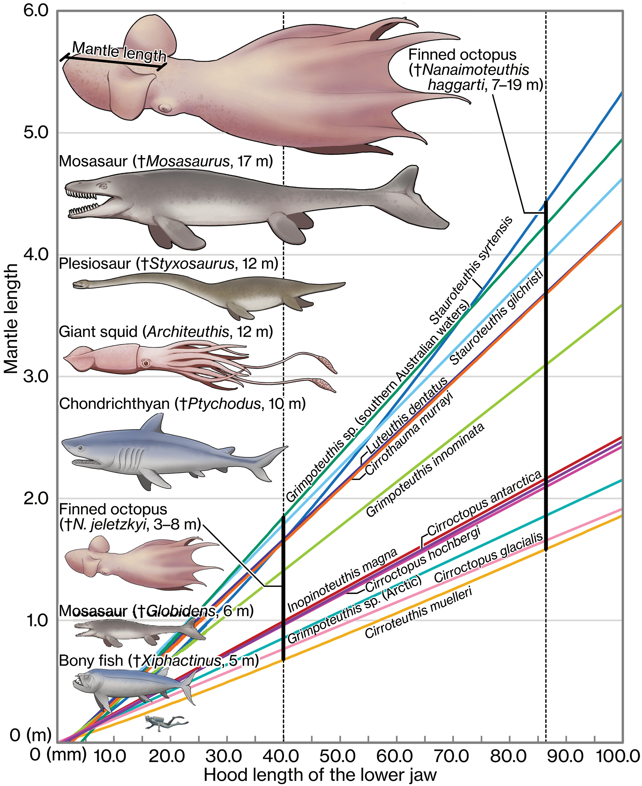 The graph shows an allometric relationship between the length of the jaw and mantle in long-bodied species of extant finned octopus . The name of the corresponding species is shown along each growth curve. The sizes of N. jeletzkyi and N. haggarti based on their largest specimen are indicated by black vertical lines. Reconstruction of these two species, the extant giant squid, and gigantic vertebrate predators in the Late Cretaceous are shown with their maximum total length.