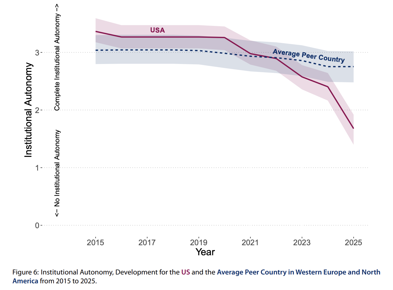 Institutional Autonomy, Development for the US and the Average Peer Country in Western Europe and North