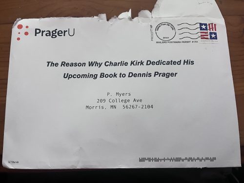 I also get lots of email from Donald Trump, which I don’t mind — please do waste a few pennies on me, I’ll never ever vote for you. The annoying one is PragerU, which sends me spam every fucking day, and now they’re sending me postal mail.