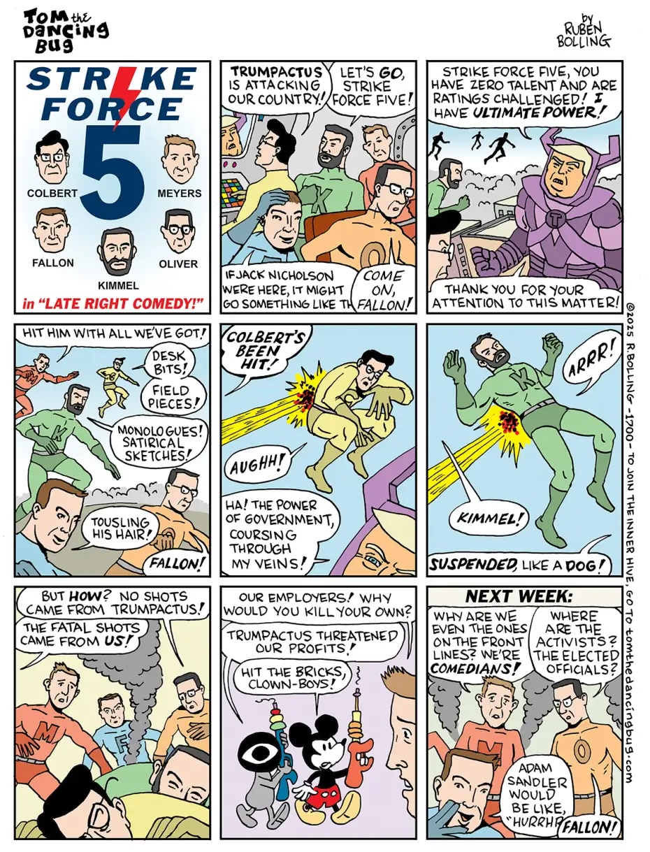 It’s good news that right-wing broadcaster Sinclair had to reverse course on their attempt to get late-night talk show host Jimmy Kimmel fired, but I have to get real about this situation. Kimmel is an entertainer, not the leader of a progressive opposition party — he’s just a guy. He’s a court jester. What we should be aware of is the fragility of that position when an autocrat takes offense at relatively mild jokes and tries to destroy a person, and we also have to recognize that there are all these undeservedly wealthy people who will eagerly jump to do the wanna-be king’s bidding. If we get rid of Trump, Sinclair will still be there pushing propaganda for the very worst people in the country.