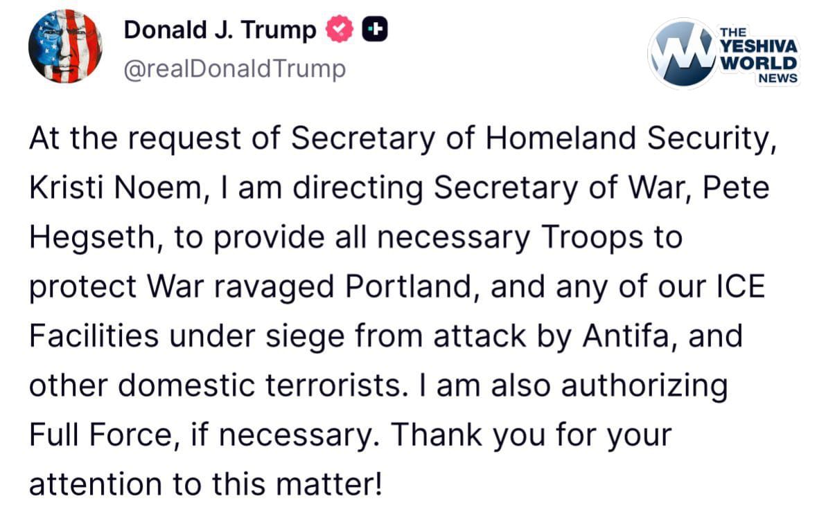 At the request of Secretary of Homeland Security, Kristi Noem, | am directing Secretary of War, Pete Hegseth, to provide all necessary Troops to protect War ravaged Portland, and any of our ICE Facilities under siege from attack by Antifa, and other domestic terrorists. | am also authorizing Full Force, if necessary. Thank you for your attention to this matter!