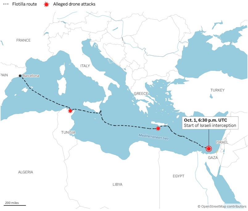 Since September first, a flotilla of 40 ships from various nations have been slowly sailing across the Mediterranean to deliver a token amount of aid to Gaza. This is a PR move — the reason they are taking so long is because they’re not bringing huge amounts of relief, but are instead trying to bring attention to Israel’s oppression.