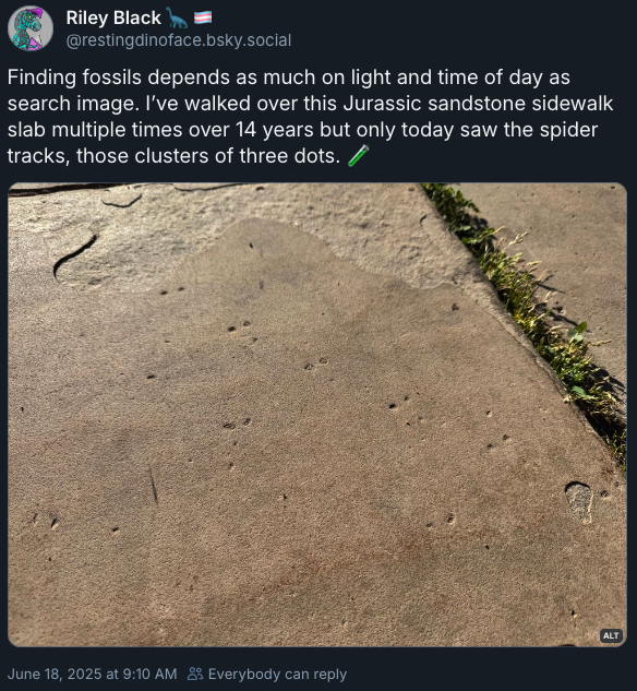 Finding fossils depends as much on light and time of day as search image. I’ve walked over this Jurassic sandstone sidewalk slab multiple times over 14 years but only today saw the spider tracks, those clusters of three dots. 🧪