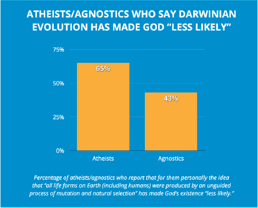 - Nearly 7 in 10 atheists and more than 4 in 10 agnostics say that for them personally, unguided chemical evolution and Darwin’s mutation/natural selection mechanism have made the existence of God “less likely.”