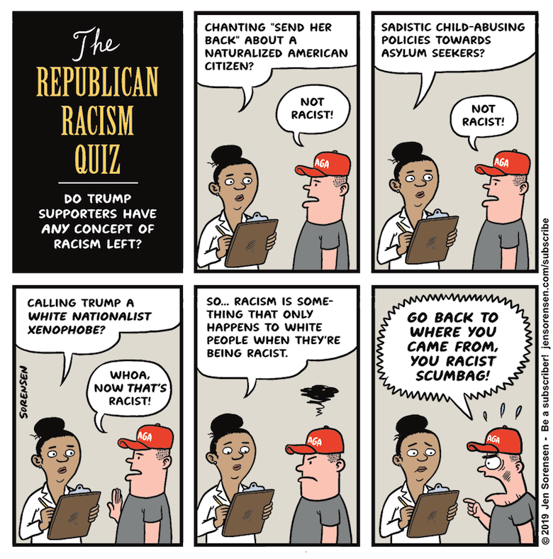 So to them racism is only something aggressive and deliberate, something that includes explicit racial slurs at the very least. To them it’s a naked and blatant hatred of somebody because of their skin colour and often the language they speak. That’s why “I can’t be racist: I have friends who are X” seems to be a good defence against the charge to them. That’s also why their racist joke or comment isn’t racist since it’s not “hateful” just demeaning and dehumanizing.