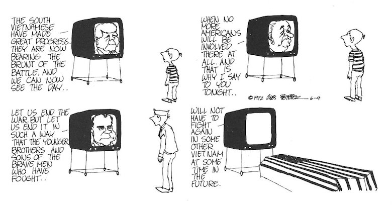 Feiffer recalls what he considered the callous response of many Americans to the news of the My Lai massacre-comparable to the widespread acceptance today of the forced separation of families at the Southern border. It’s not due to any lack of information, as Feiffer told Studs Terkel in 1974. It’s just “the process of denial, over and over again.”