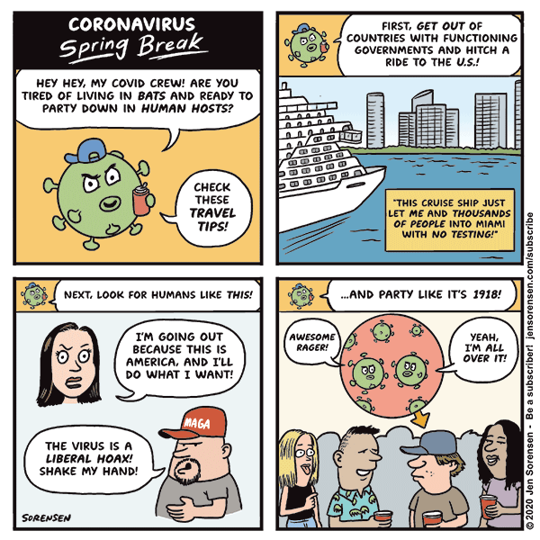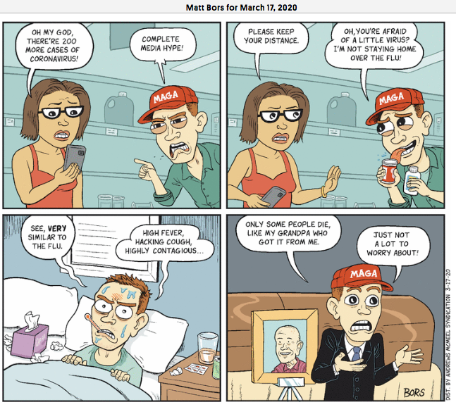 He is (of course) a Trump supporter and although he appeals to other Trump supporters to take the disease seriously, he says that he will still vote for him despite his mishandling of the pandemic because he likes his ‘other policies’. Of course he does.