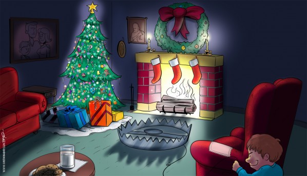 One of the jewels in our collection of ideas was the santa traps. The idea is, you build elaborate Rube Goldberg-style traps around the base of the fireplace, hoping to capture or even kill santa claus. That way, you get all the presents. Back in 2002 I mentioned this to someone I knew who had kids, and her husband thought the idea was so great that they actually did it – the youth contingent and dad kicked in and made a rubber-band activated plywood bear trap, which they put at the hearth of the fireplace, baited with cookies and a stocking.