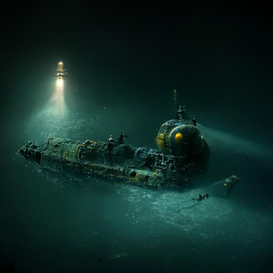 Midjourney: /imagine a russian bathyscaphe exploring the wreckage of the moskva to try to recover cryptographic secrets or perhaps a nuclear warhead.