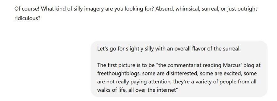 While I was writing my posting about AI, last night, I had a minor brain-fart and immediately texted myself a message not to forget it. [Text messaging, with its ability to scroll back weeks or days is a total life-saver, as is camera roll. Now, when I take something apart, I religiously photograph all the steps – even if it was something I made – because if I get distracted for a few minutes, I’ll forget what I took apart from where.] There’s a meme going around where you ask GPT for an image, and then keep asking it to get more and more ${whatever}. This can be quite fun, to watch the AI come up with representations that are more and more disconnected from reality. You know, like creativity, except “remix all that stuff in your head, harder, GPT!” for some of you.
