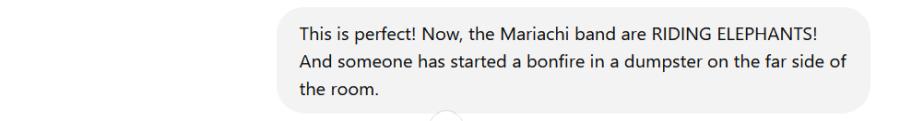 I found the elephant request amazing, particularly since I’d just seen this result from a prompt to ChatGPT: “Create a photo of an empty room with absolutely NO elephants”. You’ll have no problem guessing where it goes wrong.