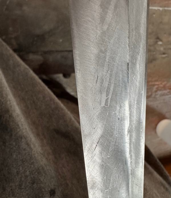 So I get to this state where my blades look I have polished them with a chocolate bar, which is where the class in sword-polishing that I took, did not go. Naturally, I did what I usually do, which is proposed a theoretical framework (the metal matting because of differential hardness) to GPT and listened to what it had to tell me. Differential hardness is also unexpectedly interesting because you have 2 ways of making metal shiny (I’m gonna add: “at least” to cover my ass) one is to remove all the scratches until it looks like a mirror – polishing them – the other is to make the scratches pretty small and then bash ’em flat – burnishing them. I’m just gonna say that matte look with the polished highlights – that’s as tactical as anything fielded until the heyday of Rome.