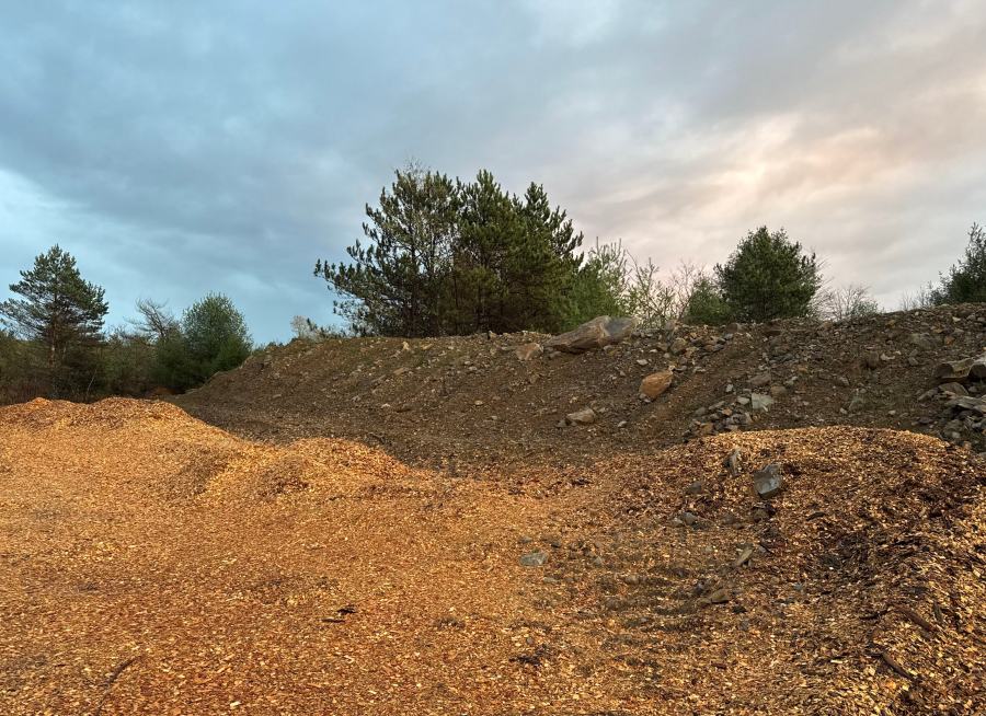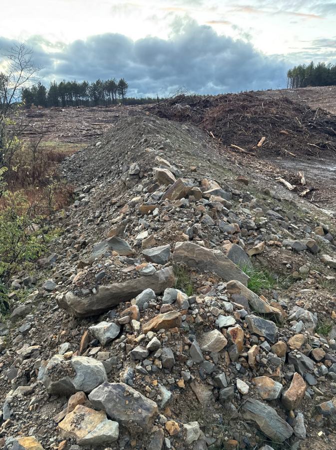 (shredded wood for eventual topsoil) – Look! ROCKS! and the best part is that they have already been blown up, crushed, shattered and stacked. I know that rocks, in their natural form, can be disturbingly large and aggressive if teased, especially during calving season. This sort of thing is a blessing and a curse because it’s got some of everything but there’s no locality left. So, if I found something that was 100% compatible with Japanese uchigomori I would still not be rich – I’d have to find more. Anyhow, it was interesting enough to get out of the truck for a look-see. GPT had made its usual list of good suggestions including that I take an old file, so I could see how any interesting rocks gummed up the teeth, or resisted a file, or attacked.