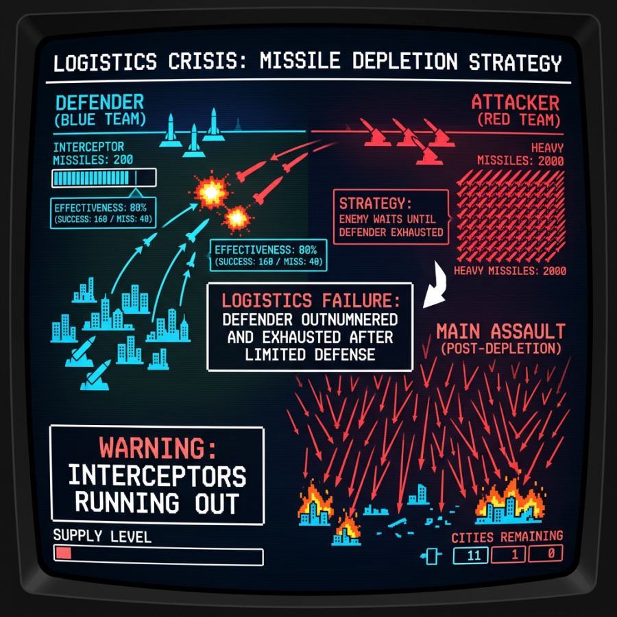 It doesn’t matter how accurate your missiles are, if the defenders’ defense systems will automatically fire at every missile coming in, until they run out of anti-missiles and are left throwing rocks. This is the kind of strategic blunder that is literally shocking to anyone who has ever had a serious thought about strategy: it sets up a situation in which defeat is guaranteed. It is the opposite of a Kobayashi Maru scenario: it’s the scenario that starfleet washouts choose because they want to wash out of starfleet and get a job at some marketing company.