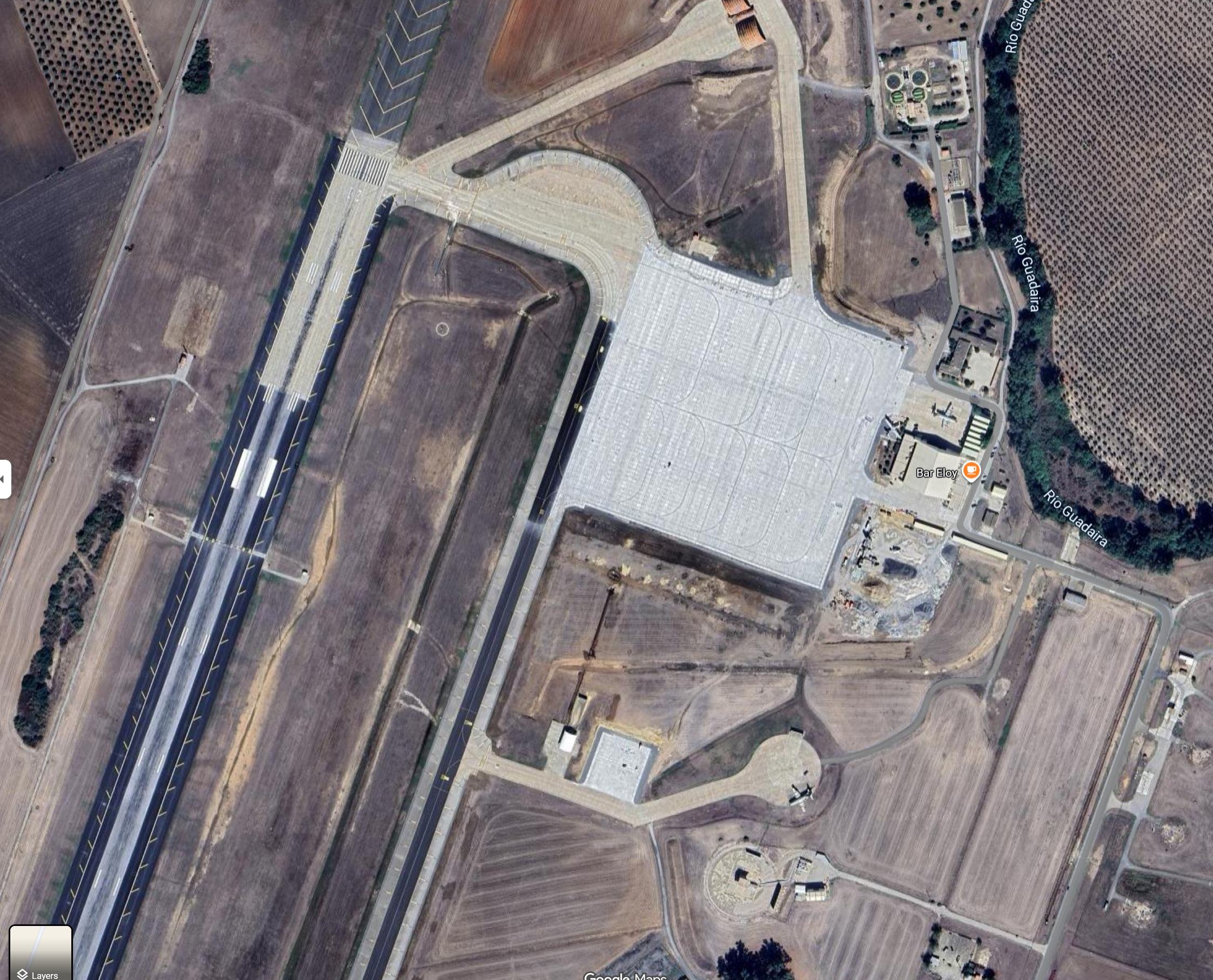 [Moron air force base in Spain. Some of the patterns are google maps’ default fill for things you are not supposed to see. It’s located here. The gray pad area just up to the right of center looks like default fill. The taxiway out, that goes under the two covered pads, is probably where the bombers park to load, so a satellite can’t see what’s being hung in them.]